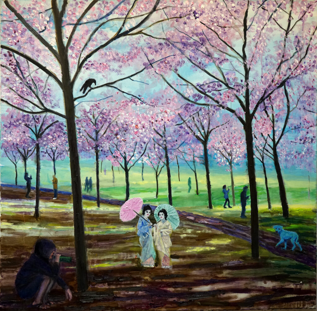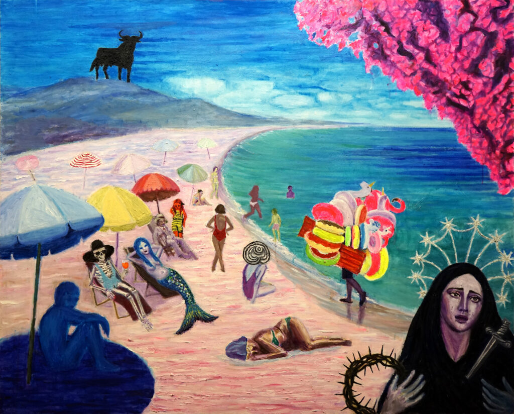 Mina målningar är gjorda av resesouvenirer, hemliv, spöken, bittra och söta stunder, akryl- och oljefärger på duk.