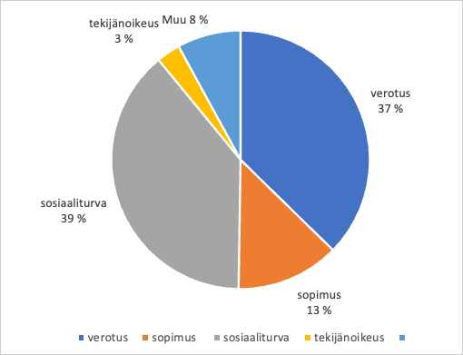 Vanhat hitit, taiteilijan verotus (37 %) ja sosiaaliturva (39 %) pitävät kärkisijoja oikeudellisen neuvonnan tilastoissa, sopimusoikeus otti poikkeuksellisen loppukirin vuoden loppua kohden (13 %). Sosiaaliturvassa korostuu työttömyysturvakysymykset (66/78 tapauksesta). Kategoriassa muu on kaikenlaista YEL-tulon määrittelystä laskutuskäytäntöihin, yritysmuotoihin ja apurahoihin liittyviin kysymyksiin. Tekijänoikeuskysymykset on pääasiassa ohjattu Kuvastolle, eivätkä ne näy tilastossa.